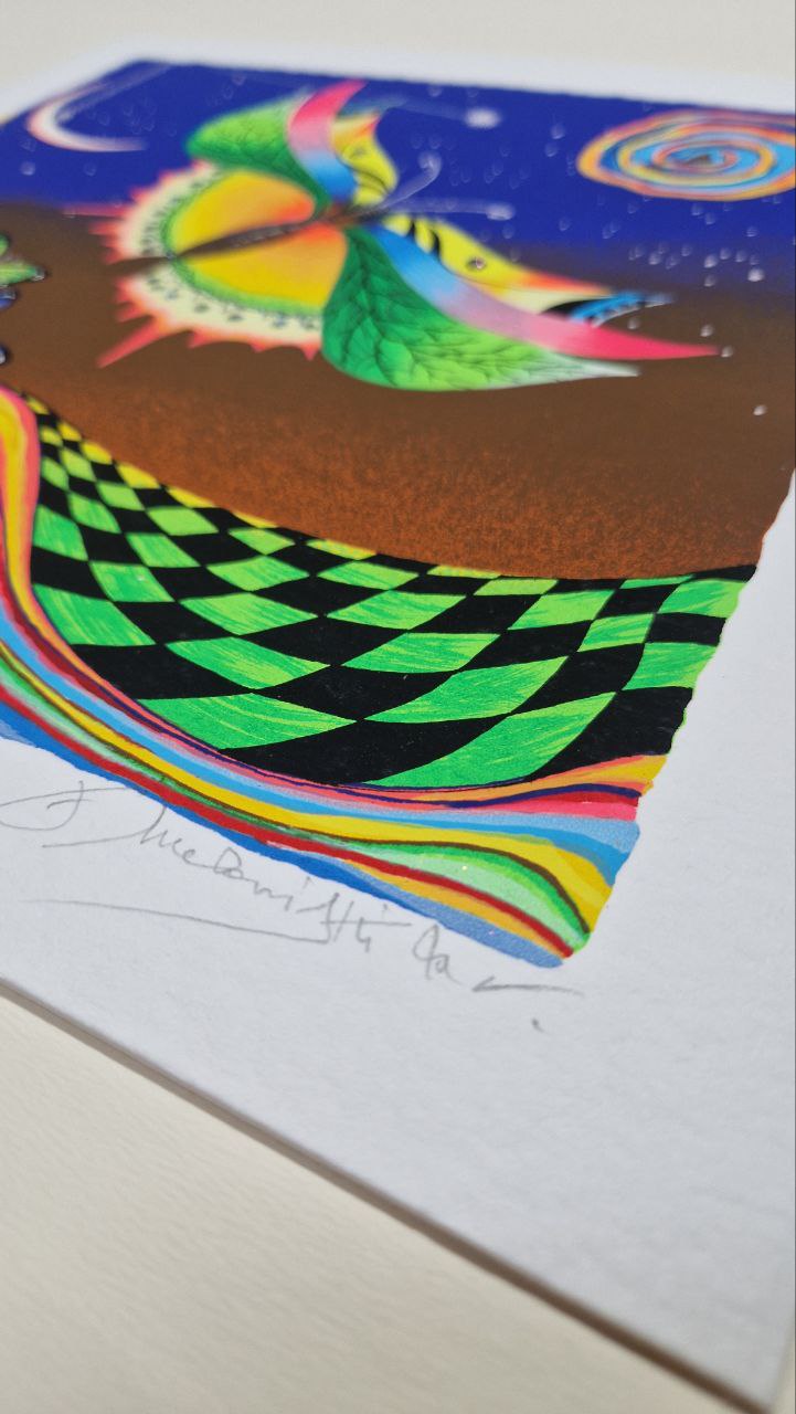 Meloniski dipinge quello che molti dimenticano: che possiamo volare anche senza ali. Questa farfalla nasce dalla terra piena di colori e punta verso le stelle. Ti ricorda che ogni giorno puoi scegliere: restare a terra o spiccare il volo. Il blu profondo del cielo notturno abbraccia la luna e il sole insieme, come a dire che giorno e notte convivono dentro di noi. I colori accesi della farfalla sono la tua energia, quella che aspetta solo di essere liberata.