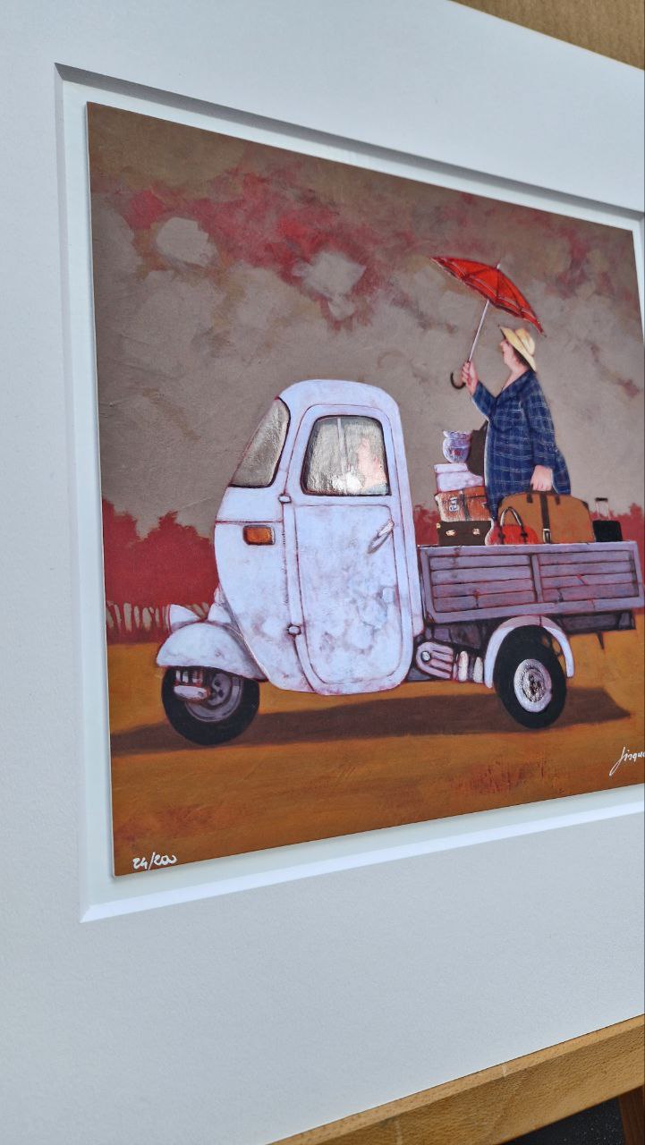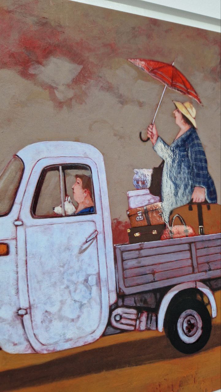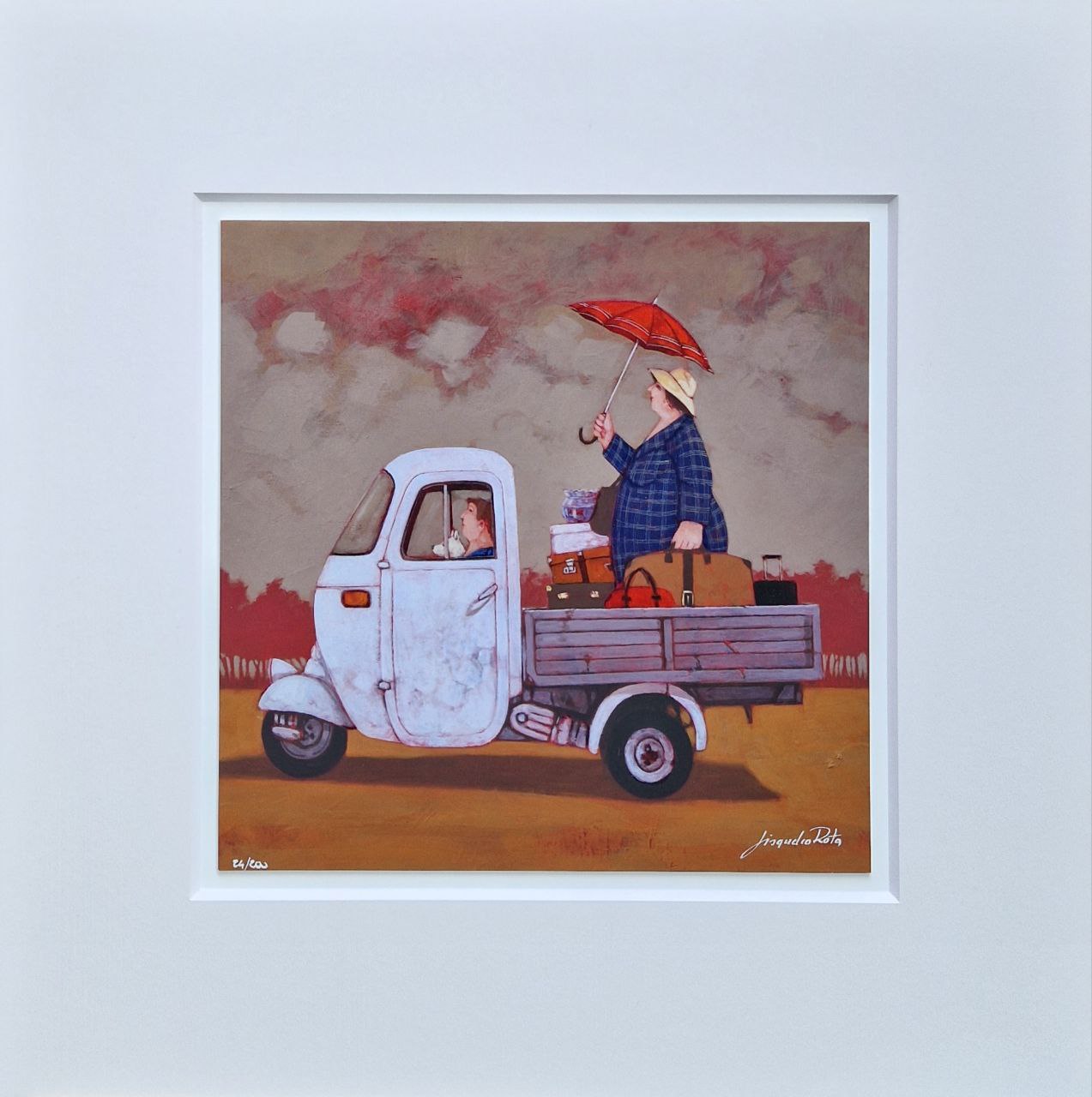 In questa affascinante opera di Lisandro Rota, la scena ritrae una donna bonariamente paffuta in piedi sul retro di un piccolo furgoncino Ape, con un'evidente espressione di serenità e ironia. Il furgone, verniciato di bianco, è carico di valigie e scatole, simboli di un viaggio o di un'avventura imminente. La donna indossa un abito a scacchi colorato e un cappello di paglia, che le conferisce un'aria rilassata e familiare, mentre tiene aperto un ombrellino rosso che contrasta vivacemente con il cielo grigio e nuvoloso sullo sfondo. Alla guida del veicolo, un uomo osserva con affetto e pazienza, aggiungendo una nota di complicità e tenerezza alla composizione. Lo sfondo sfumato di rosso e grigio evoca un'atmosfera nostalgica ma vivace, tipica delle opere di Rota, che riesce a fondere con maestria l'ironia e l'affetto nelle sue rappresentazioni.