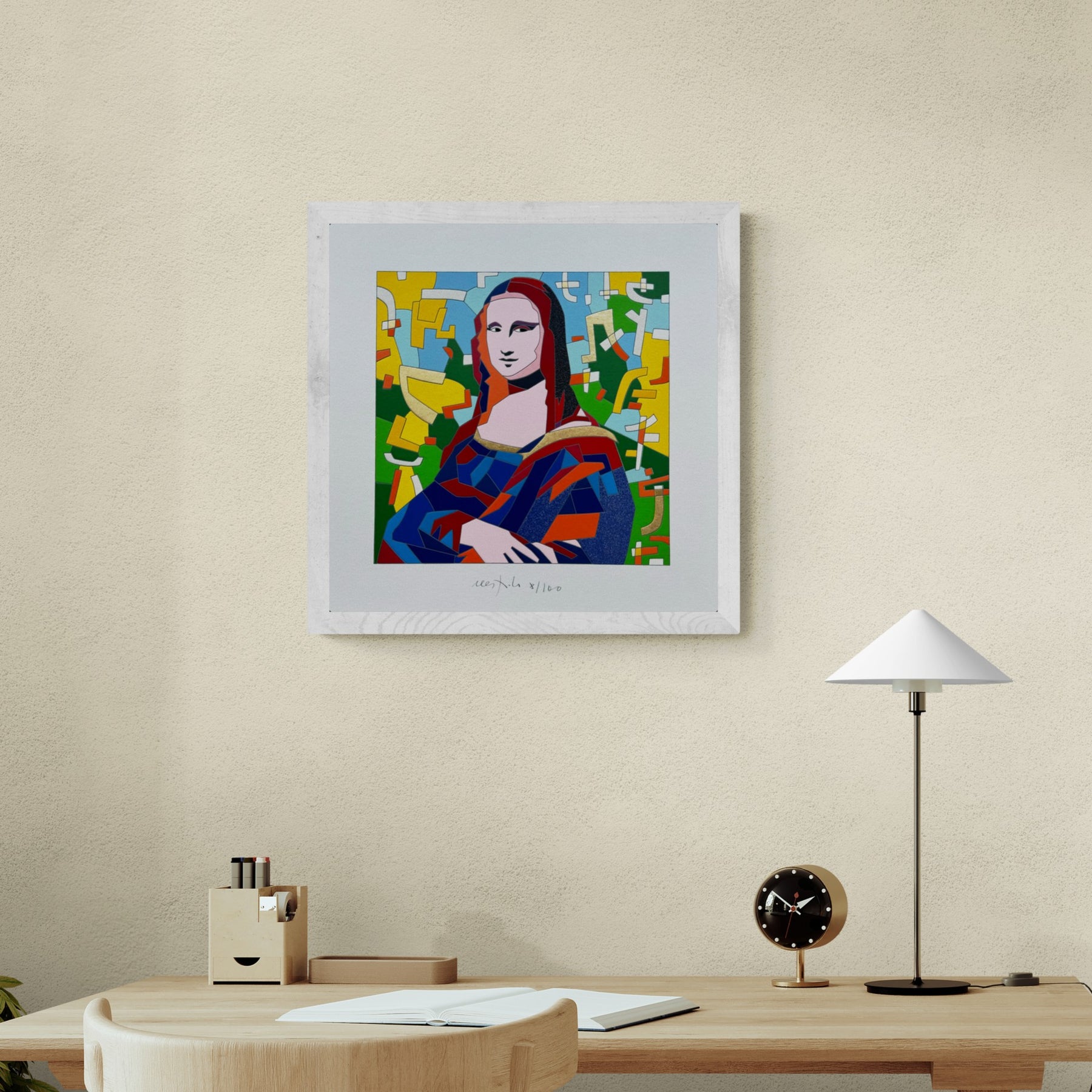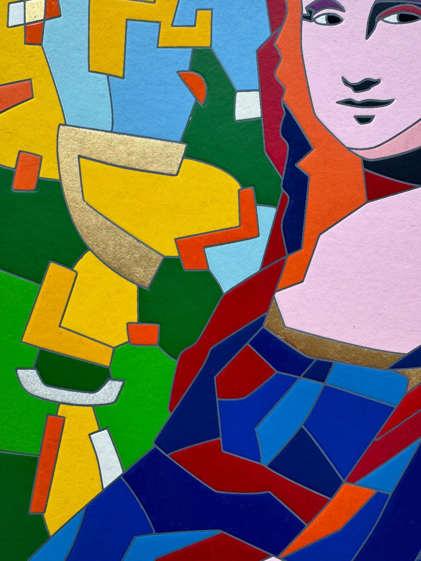 In "Buongiorno Lisa", il Maestro Ugo Nespolo rivolge il suo sguardo colto e ironico all'icona più celebre della pittura mondiale: la Monna Lisa di Leonardo da Vinci. L'opera non è una semplice citazione, ma una vera e propria "riscrittura" semiologica. Nespolo scompone l'immagine classica attraverso la sua inconfondibile estetica a incastri, sostituendo lo sfumato leonardesco con la precisione netta del colore piatto e la ricchezza dei materiali moderni.
