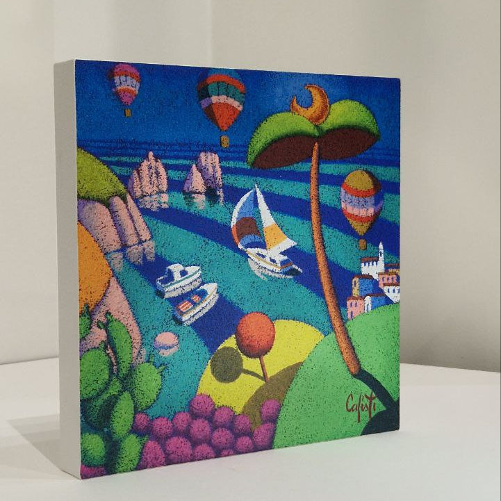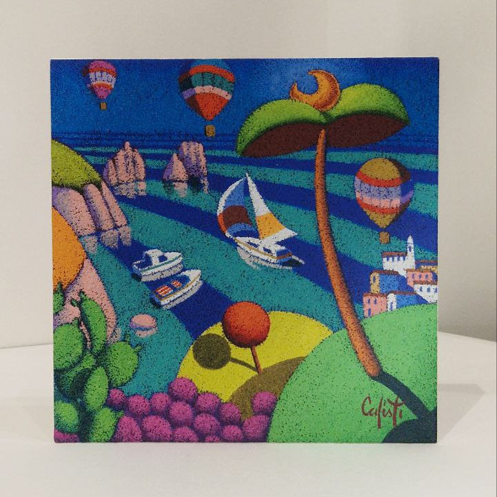 “Capri New” di Stefano Calisti trasforma l’isola in un piccolo sogno a colori: il mare è costruito a fasce azzurre e blu, solcato da barche e velieri, mentre le rocce di Capri emergono sullo sfondo insieme a mongolfiere sospese nel cielo. Un grande albero stilizzato in primo piano e le colline dai toni accesi completano un paesaggio dinamico, luminoso e gioioso.