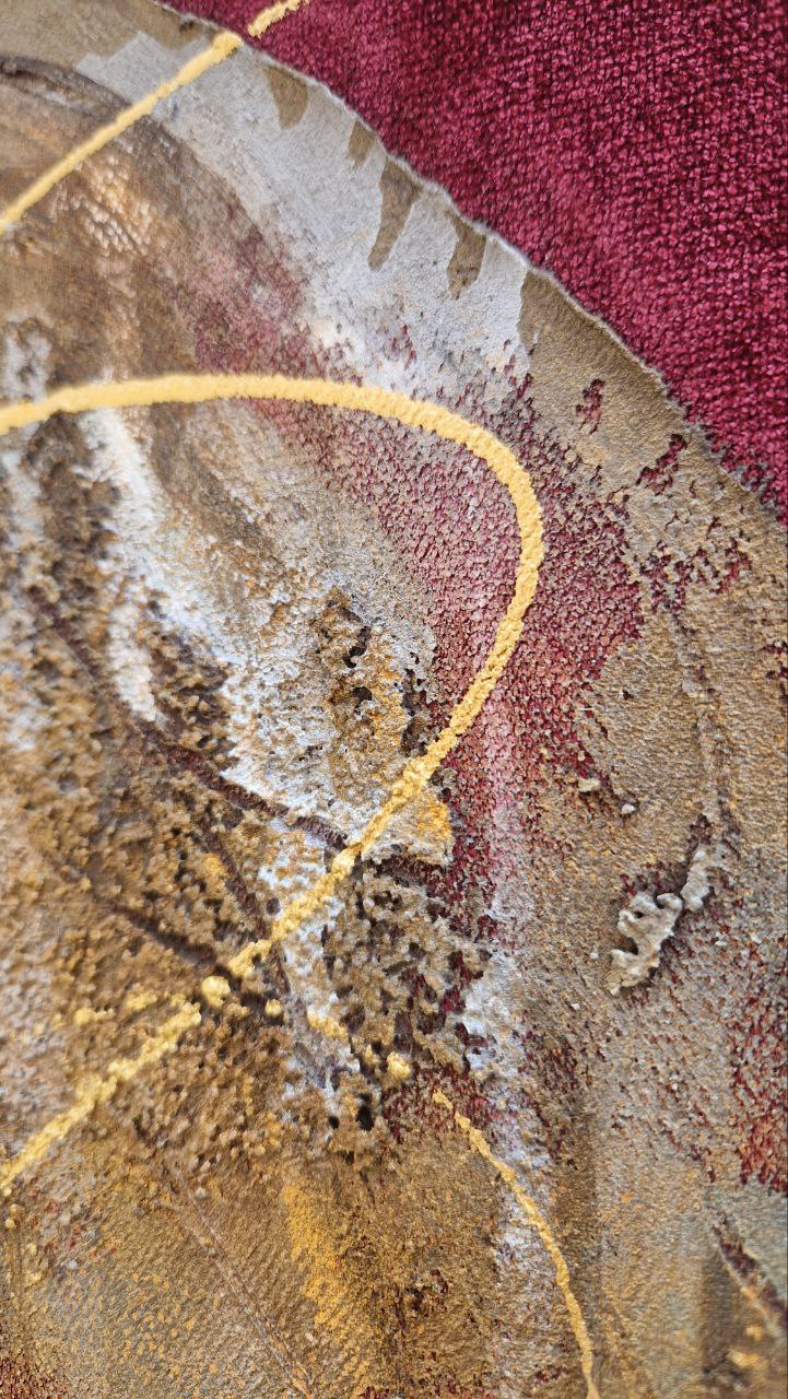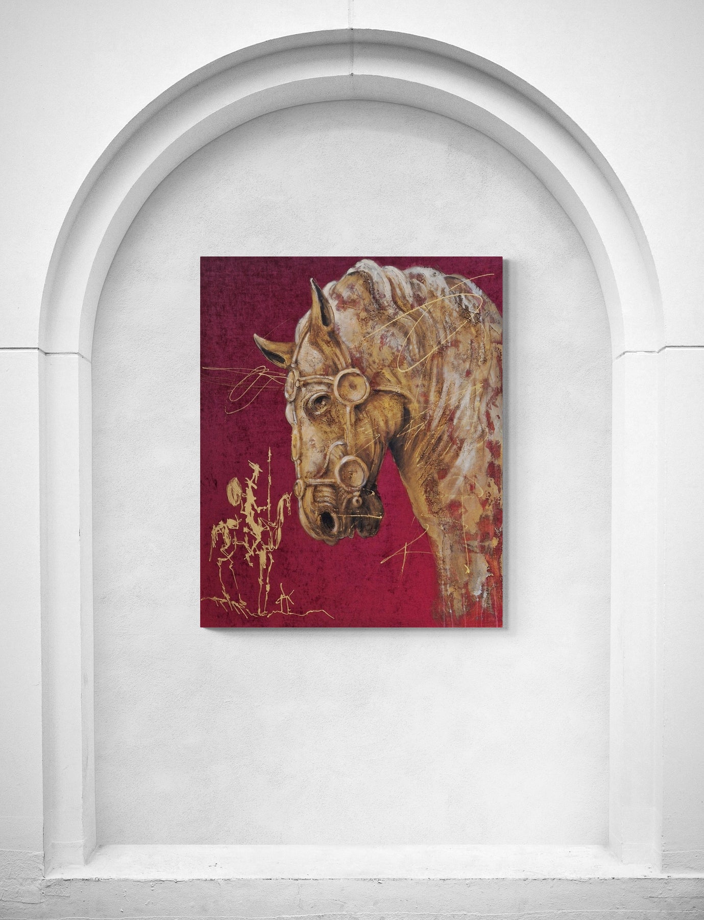 Cavallo Romano con Picasso è un’opera che unisce il fascino senza tempo dell’iconografia classica alla forza visionaria dell’arte contemporanea. Margherita Lipinska, artista polacca che vive e lavora a Roma, dà vita a un cavallo monumentale, reso materico grazie alla tecnica acrilica su velluto, mentre un delicato disegno dorato omaggia il tratto di Pablo Picasso, evocando la sua rilettura del Don Chisciotte. La scelta del velluto come supporto pittorico non è casuale: la texture preziosa dialoga con la memoria e la storia, trasformando il quadro in un arazzo contemporaneo, vibrante e sensuale.