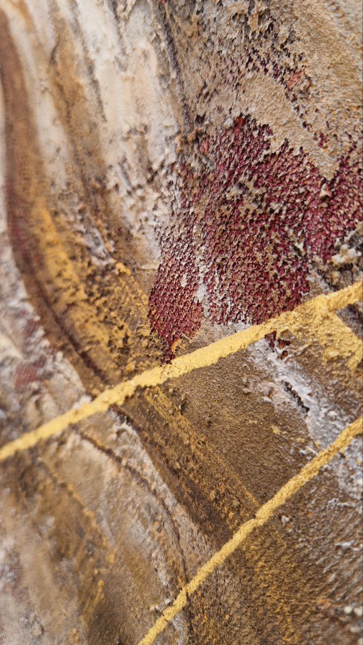 L'opera è stata realizzata su stoffa rossa, uno dei materiali preferiti dall'artista.