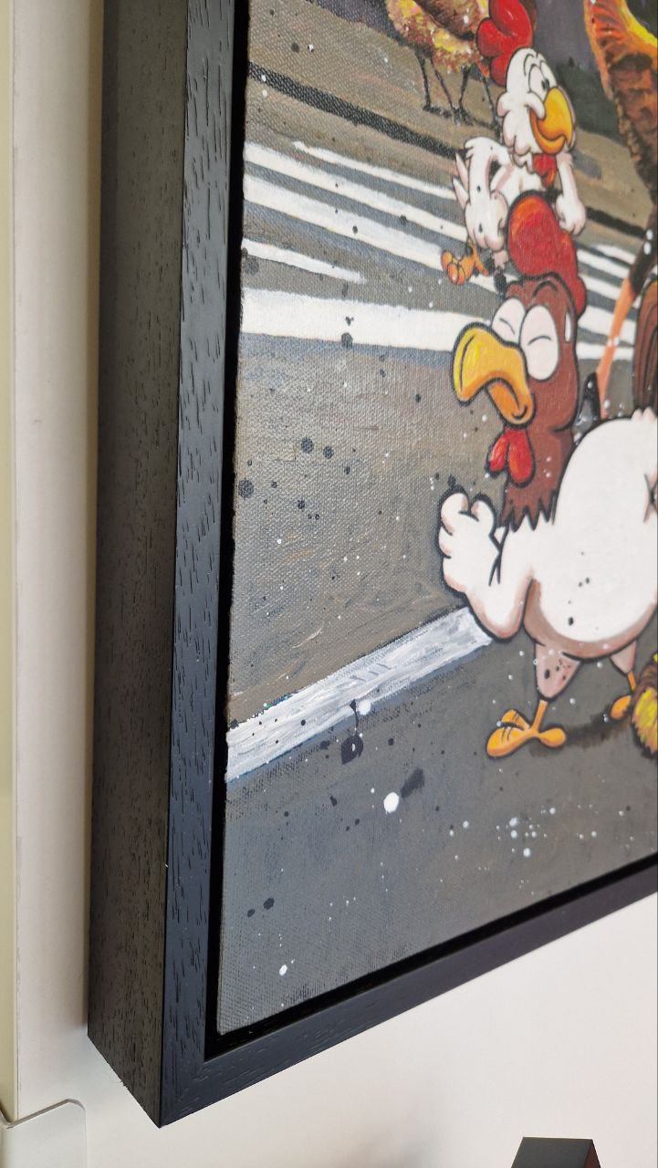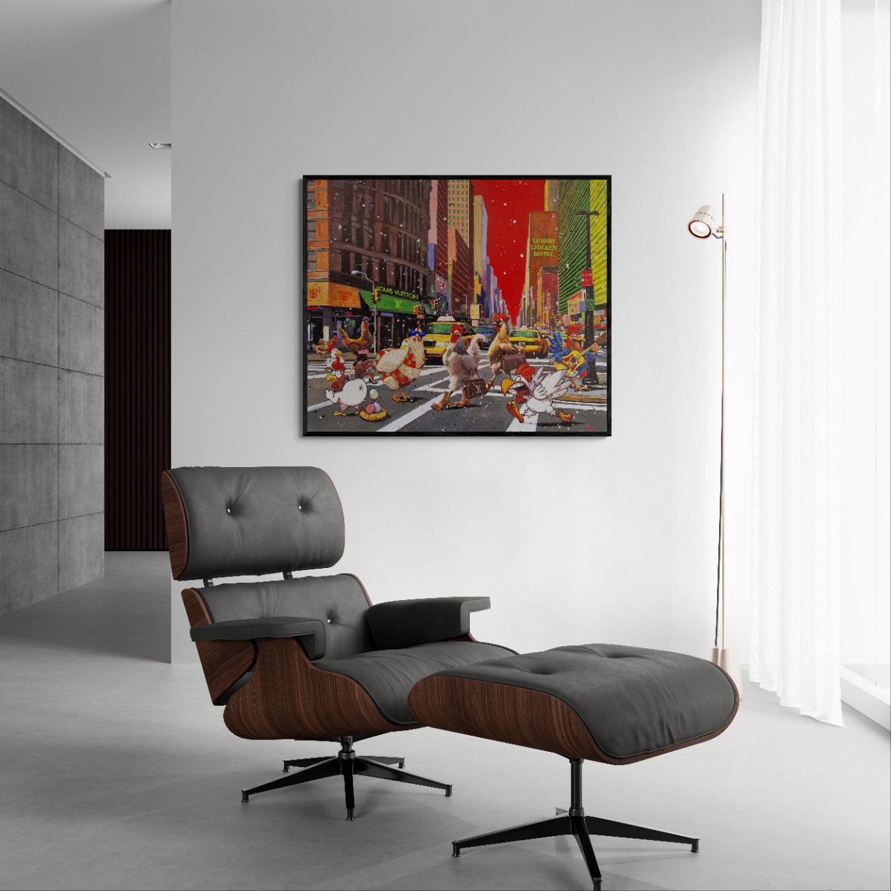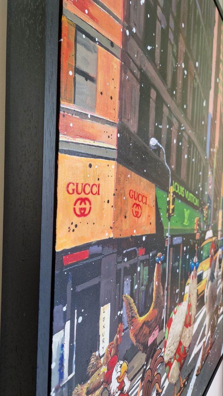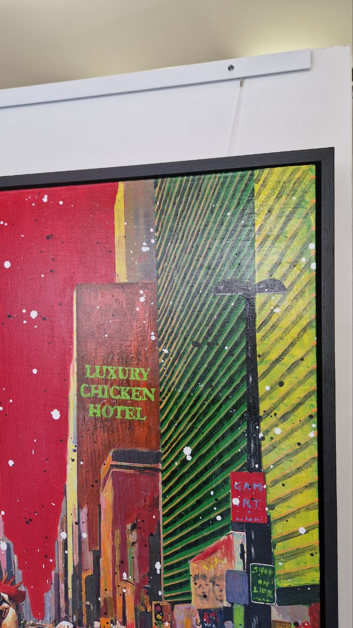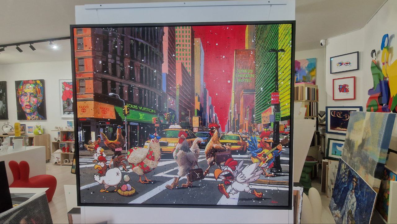 "Chick City" è un'esplosione di satira sociale e fantasia libera, dove Giovanni Alfonso Mileo trasforma l'incrocio più famoso del mondo in un palcoscenico surreale. In questa tela, la frenesia di New York — tra taxi gialli e vetrine di lusso come Louis Vuitton e Gucci — viene invasa da una sfilata di galli e galline antropomorfi, elegantemente accessoriati e carichi di personalità.
