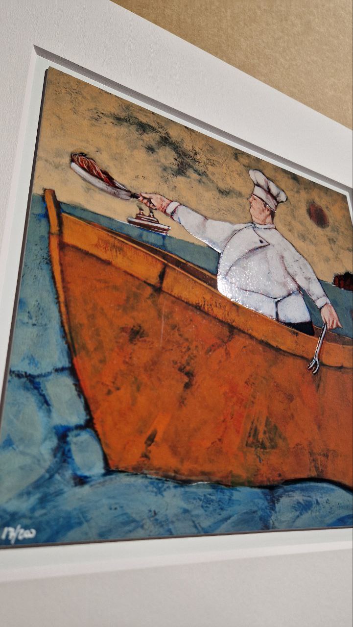 Un cuoco corpulento, vestito con una candida divisa bianca e un grande cappello da chef, si trova al centro di una scena surreale. Con fare disinvolto e ironico, naviga su una piccola barca gialla che quasi sembra una vasca da bagno, immersa in un mare di color celeste chiaro. Il cuoco tiene in una mano un enorme coltello da cucina e nell'altra un piatto di carne ben cucinata. La bandiera svizzera, posizionata sul retro della barca, aggiunge un tocco di curiosità alla composizione. Sullo sfondo, il cielo assume tonalità aranciate e marroni, accentuate da un sole scuro che osserva la scena con ironica indifferenza. Il quadro cattura magistralmente la fusione tra l'umorismo affettuoso e una quieta serenità, tipica delle opere più recenti di Lisandro Rota.