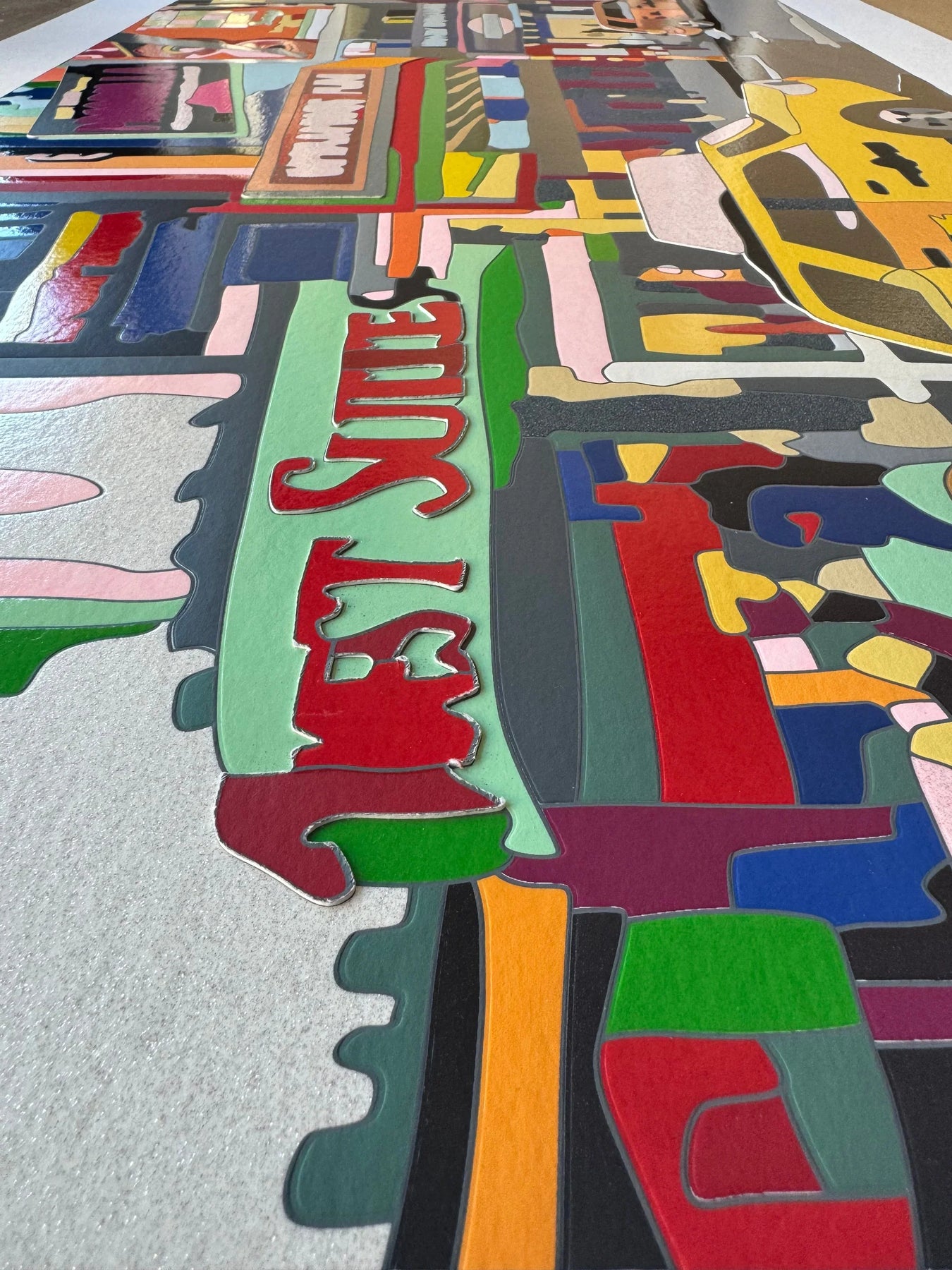 "New York Avenue" rappresenta la sintesi perfetta del linguaggio colto ed eclettico di Ugo Nespolo, un artista che ha saputo attraversare le avanguardie — dal Futurismo alla Pop Art, fino all'Arte Povera — mantenendo un'identità visiva inconfondibile. In questa visione metropolitana, il Maestro non si limita a ritrarre una strada, ma ne seziona il ritmo vitale attraverso una composizione ad incastro, tipica della sua ricerca semiologica e formale.