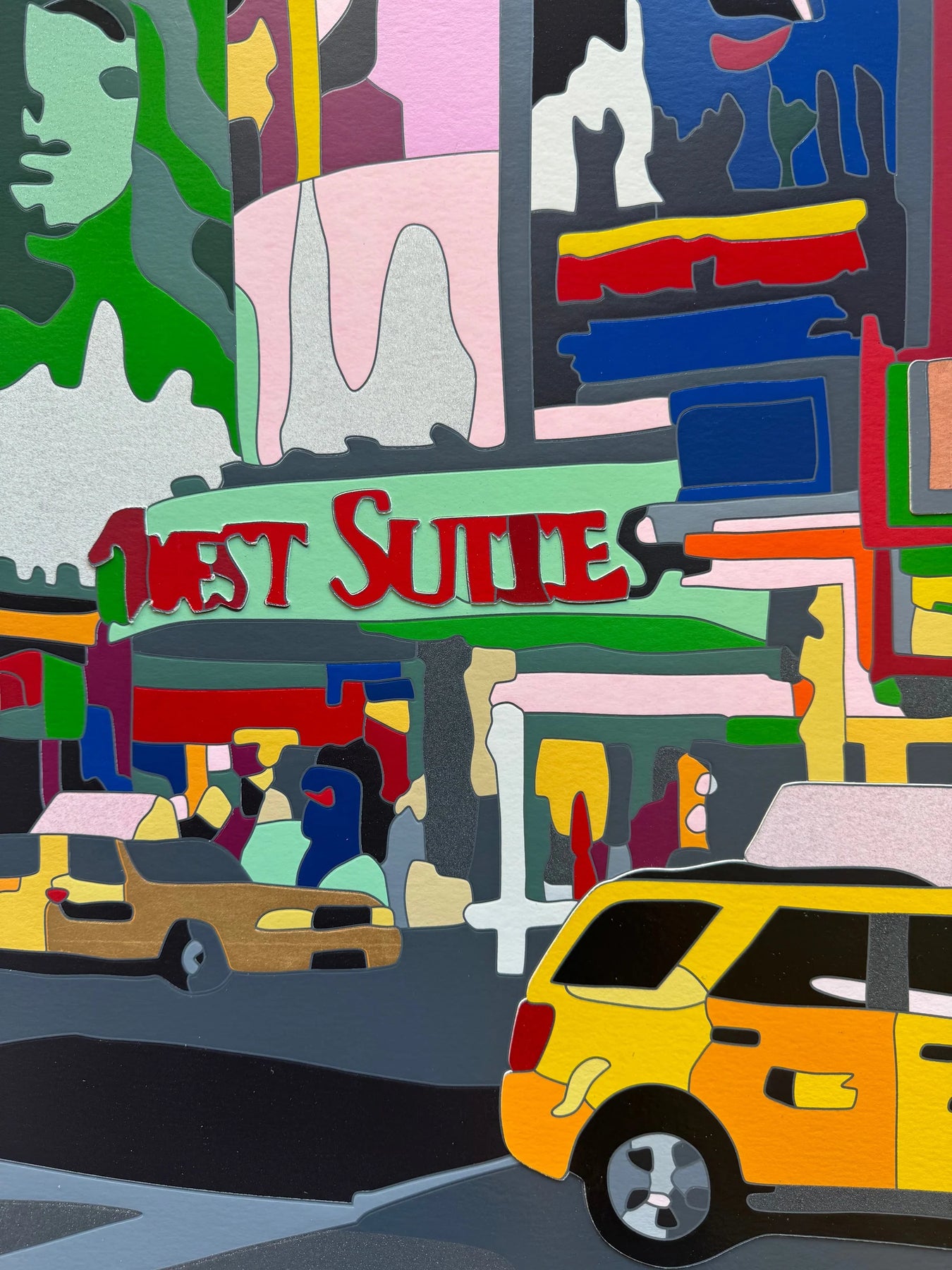 Il cuore concettuale dell'opera risiede nella capacità di Nespolo di trasformare il caos urbano in un mosaico ordinato di segni e colori. Influenzato dai suoi viaggi negli Stati Uniti e dai contatti con la realtà del Newdada e della Pop Art americana, l'artista restituisce una New York pulsante, dove i celebri taxi gialli e le insegne luminose diventano tasselli di un racconto corale. La prospettiva è appiattita e dinamica, esaltando quel carattere ludico e ironico che eleva l'elemento quotidiano a icona d'arte.