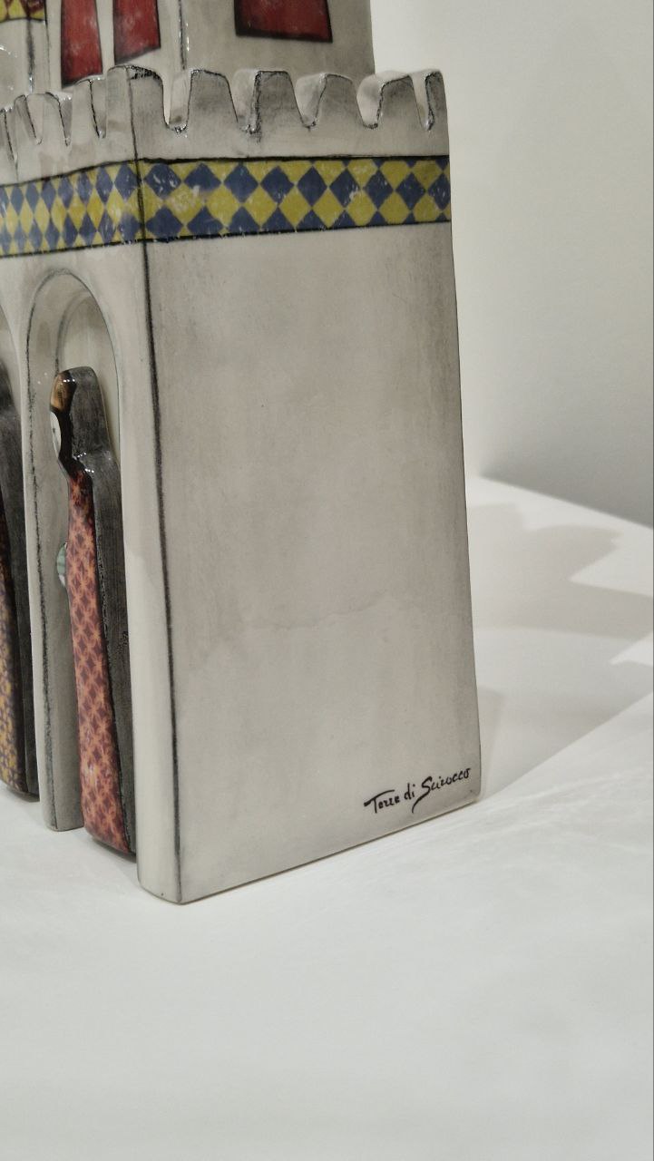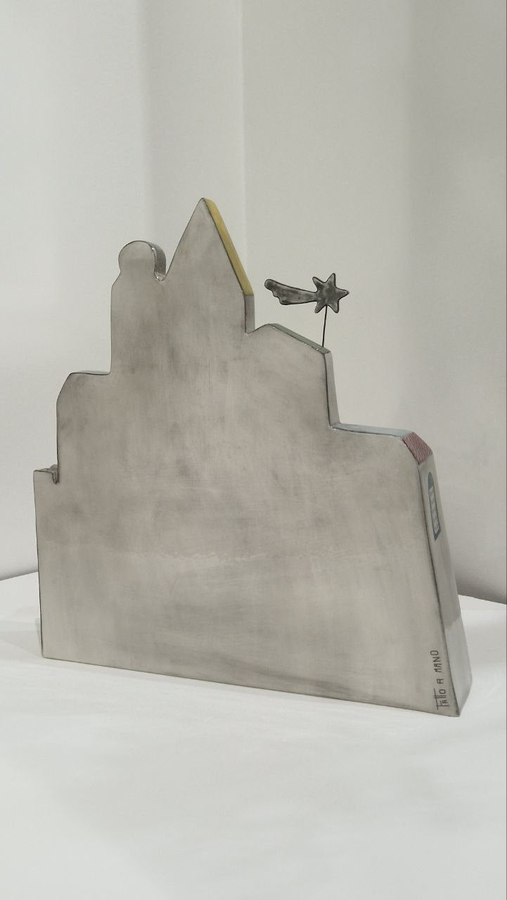Il presepe Terre di Scirocco reinterpreta la Natività in chiave contemporanea attraverso un raffinato paesaggio architettonico stilizzato. Le sagome di Maria, Giuseppe e del Bambino Gesù sono inserite sotto una sequenza di archi, mentre ai lati compaiono i personaggi in cammino verso la scena sacra, creando una vera e propria città-presepe compatta e scenografica.