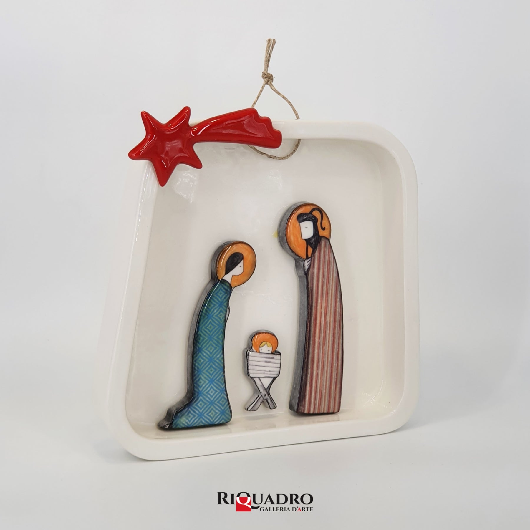 Il Presepe Teatrino con Stella Cometa reinterpreta la scena della Natività in chiave contemporanea e minimalista. Realizzato in ceramica smaltata dai maestri ceramisti di Terre di Scirocco, si presenta come un elegante teatrino bianco che incornicia le figure stilizzate della Sacra Famiglia: Maria, Giuseppe e il Bambino Gesù, modellati con linee essenziali e pulite per una lettura moderna del presepe tradizionale.
