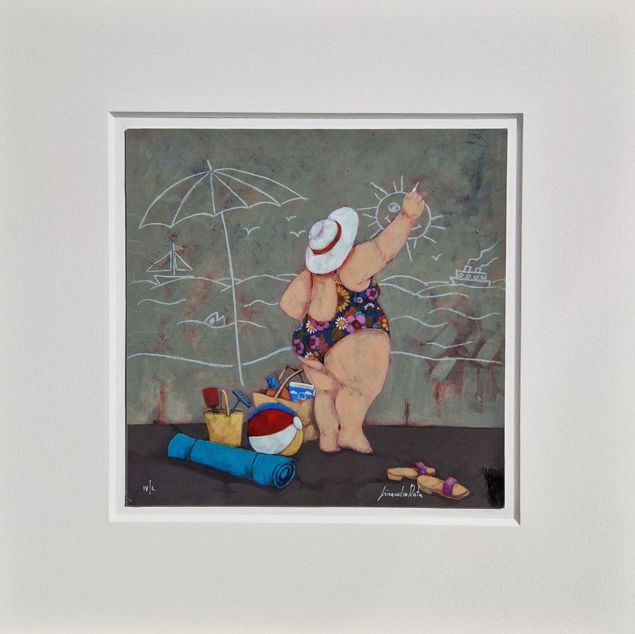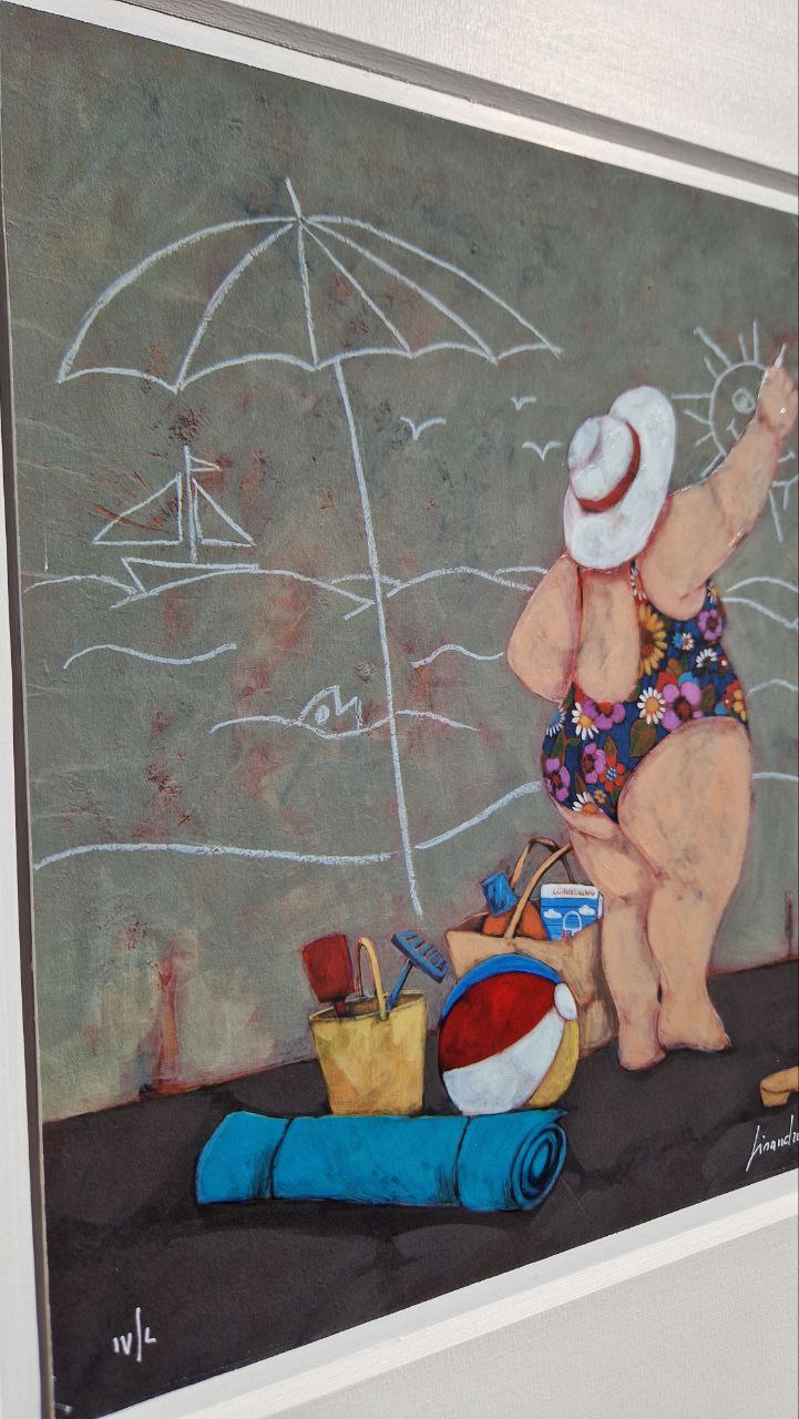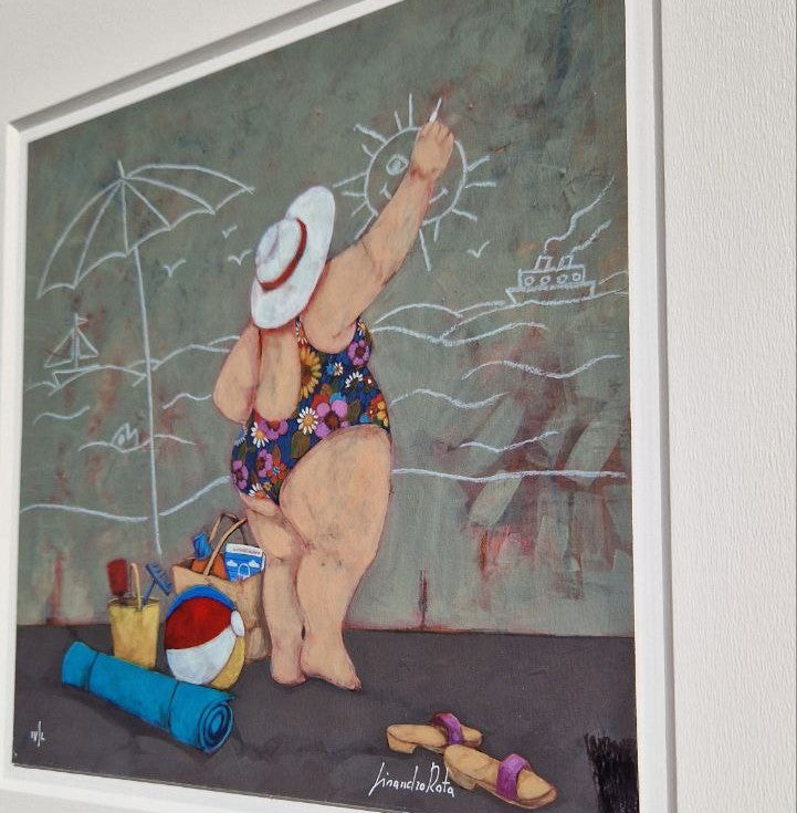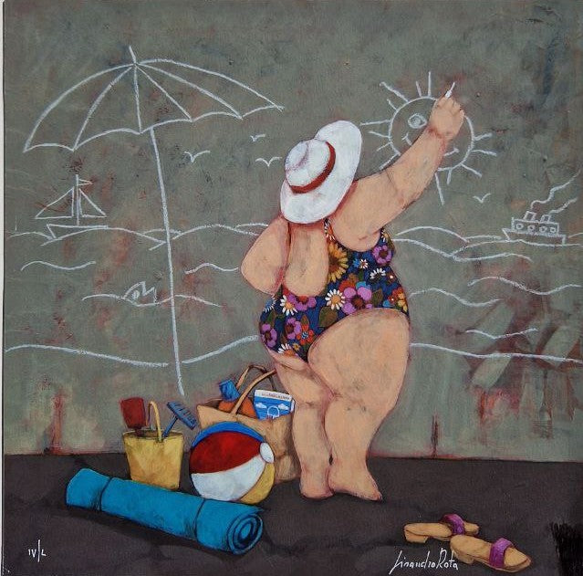 In questo vivace e giocoso dipinto di Lisandro Rota, una figura femminile di generose proporzioni, vestita con un colorato costume da bagno decorato con fantasie floreali, si diverte a disegnare sulla sabbia della spiaggia. Indossa un grande cappello bianco, che la protegge dal sole mentre, con la sua mano, traccia un semplice disegno di un sole raggiante e di onde marine sullo sfondo. Ai suoi piedi, vari strumenti da spiaggia, tra cui una palla colorata, secchielli e palette, suggeriscono un’immutata voglia di spensieratezza e un ritorno all'infanzia. Vicino alla figura si trovano un materassino arrotolato di colore azzurro e un paio di sandali lilla, indicativi di una giornata di rilassamento totale. Sullo sfondo, i semplici schizzi di barche a vela e ombrelloni contribuiscono a creare un'atmosfera idilliaca e nostalgica. Con la sua bonaria ironia, Rota celebra in questa opera la gioia delle piccole cose, catturando un momento di pura e genuina felicità estiva.