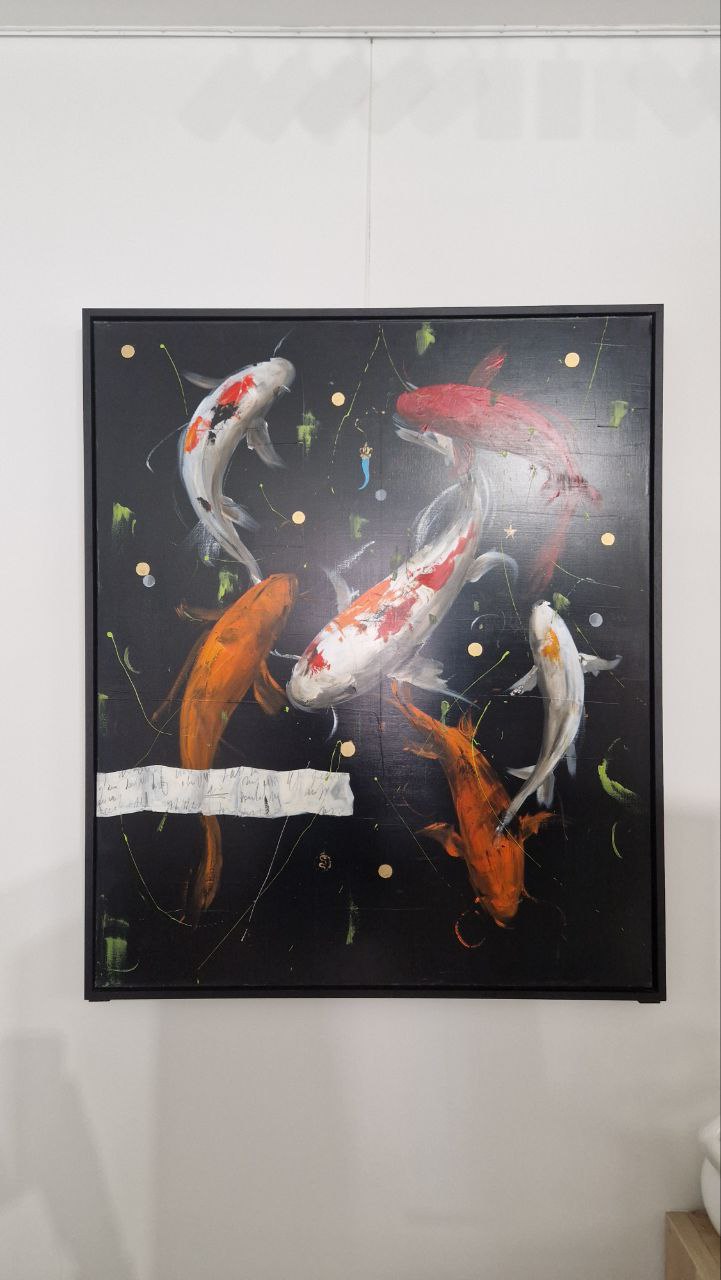 Luca Bellandi — nato a Livorno nel 1962, formatosi all'Accademia di Belle Arti di Firenze, pittore che da trent'anni costruisce un linguaggio in cui la tradizione toscana e la gestualità dell'arte americana si incrociano senza annullarsi — porta su questa grande tela sette carpe koi in pieno nuoto. Sette: il numero della fortuna per eccellenza in molte culture orientali. Non è un caso. Non lo è mai, con Bellandi.