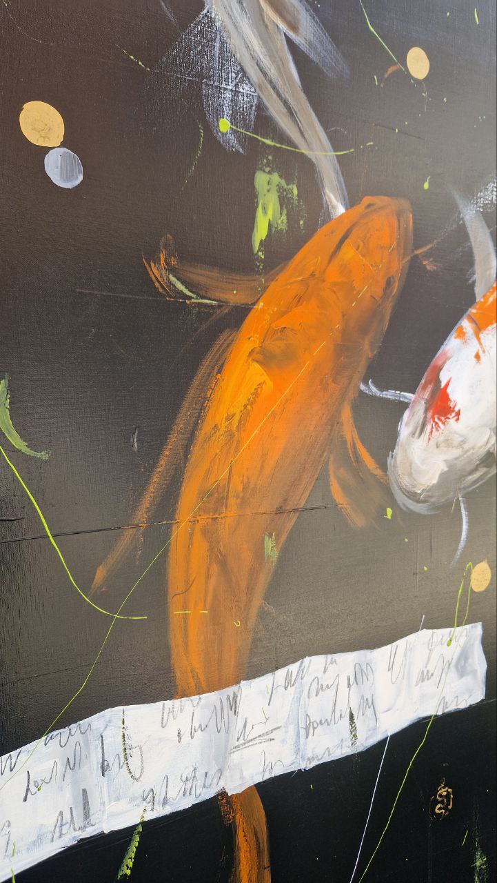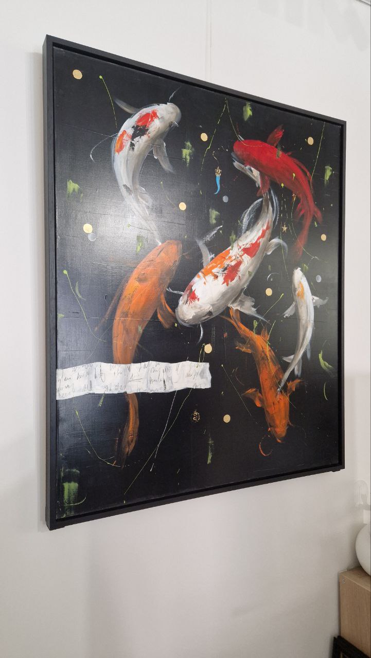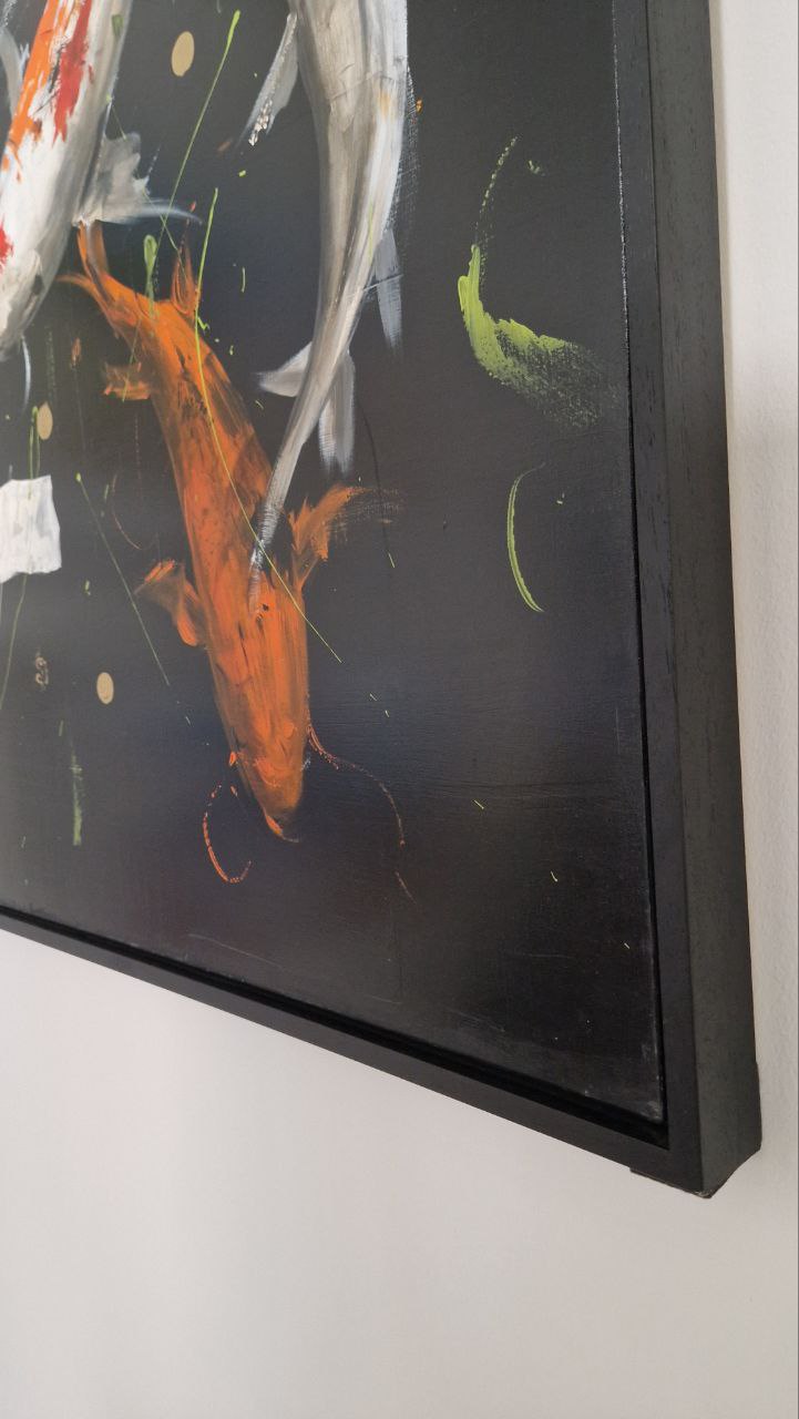 Le carpe si muovono in spirale attorno al centro del quadro con una grazia che ha qualcosa di cosmico — ognuna nella sua direzione, eppure tutte parte dello stesso vortice. Il nero del fondo non è vuoto: è acqua profonda, è spazio, è il silenzio da cui emerge ogni forma vivente. Su questo buio, Bellandi dipinge con un gesto ampio e sicuro — il segno energico che è la sua firma — e le carpe prendono corpo in pennellate di arancio bruciato, bianco puro, rosso acceso. Ognuna ha la sua personalità. Ognuna ha il suo peso specifico nell'opera.