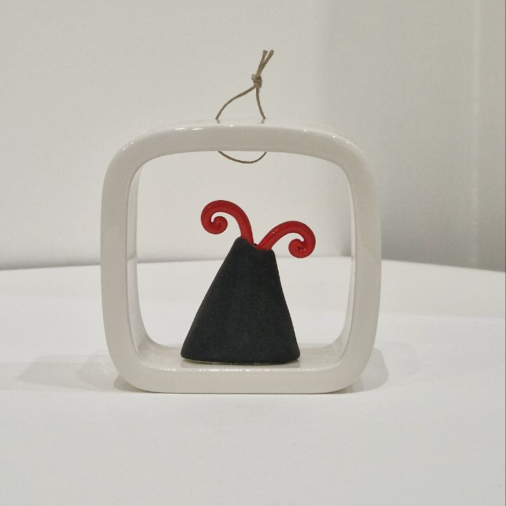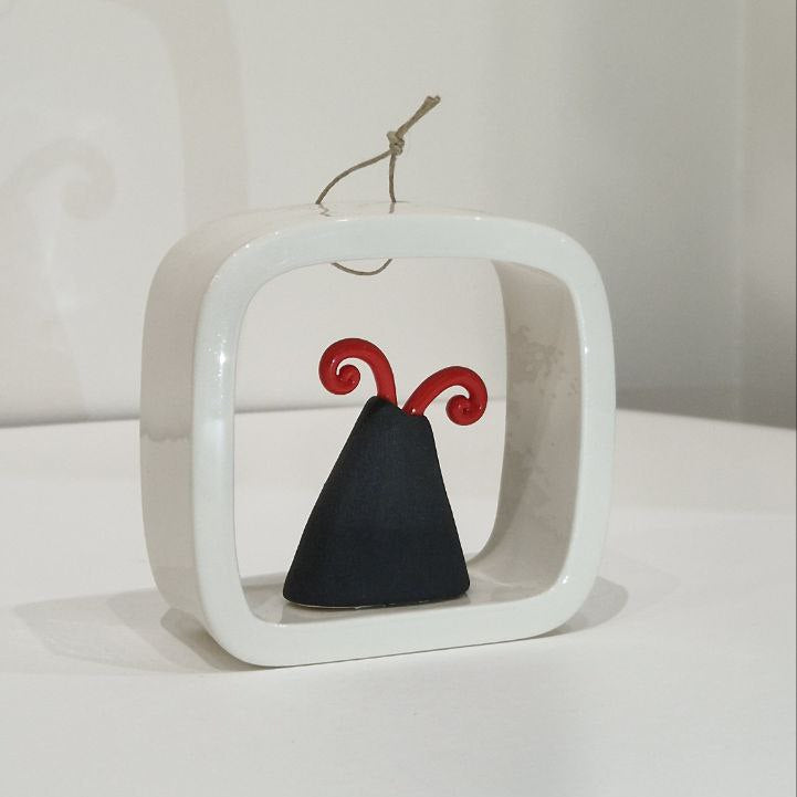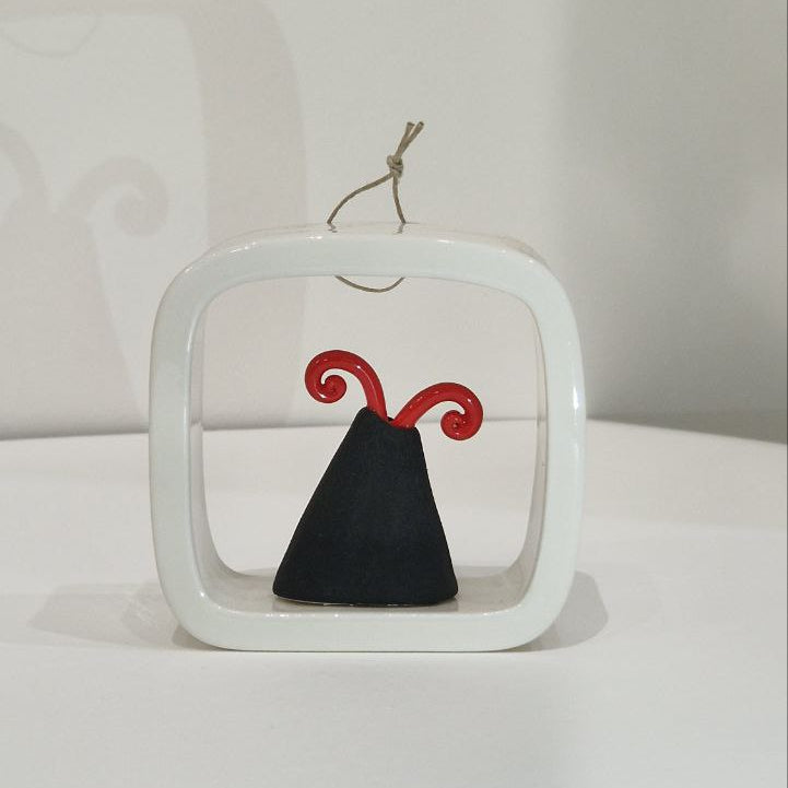 All’interno di una cornice in ceramica bianca, dalle linee morbide e minimaliste, si staglia un Vesuvio nero stilizzato, da cui emergono due riccioli rossi che richiamano il corno portafortuna: un doppio simbolo di energia, forza e buona sorte.